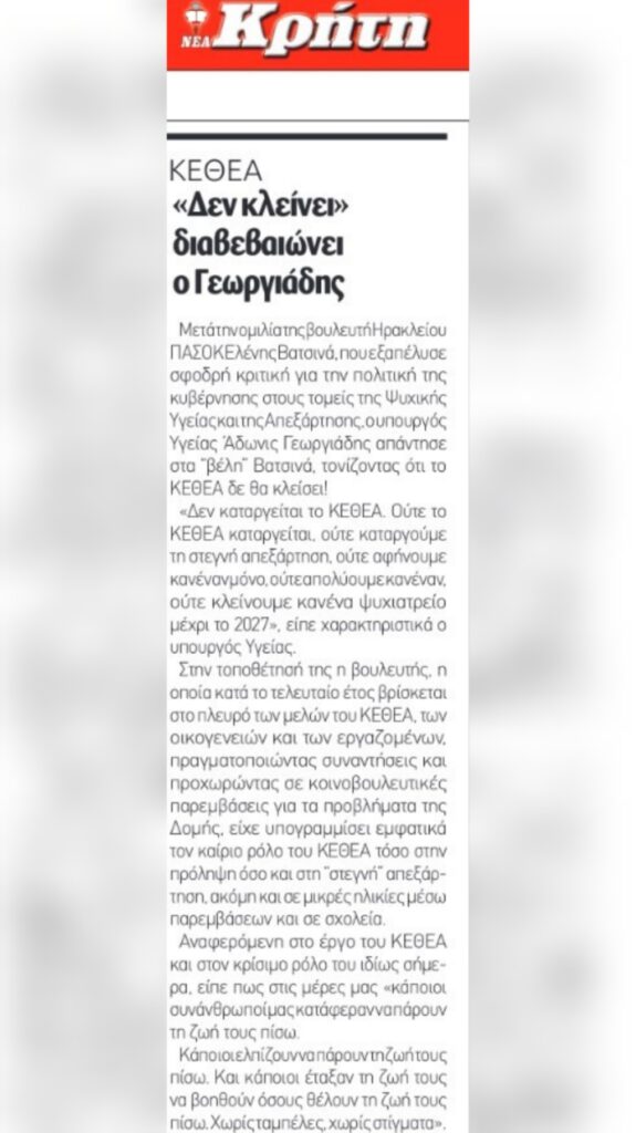 Εφημερίδα “Νέα Κρήτη” (31.07.2024)31_07_2024-5Λήψη Προηγούμενο Άρθρο Άδωνις Γεωργιάδης στην Ελένη Βατσινά: Το ΚΕΘΕΑ δεν θα κλείσει Επόμενο Άρθρο Το ΚΕΘΕΑ, η Βατσινά και ο Άδωνις