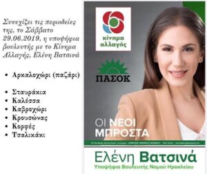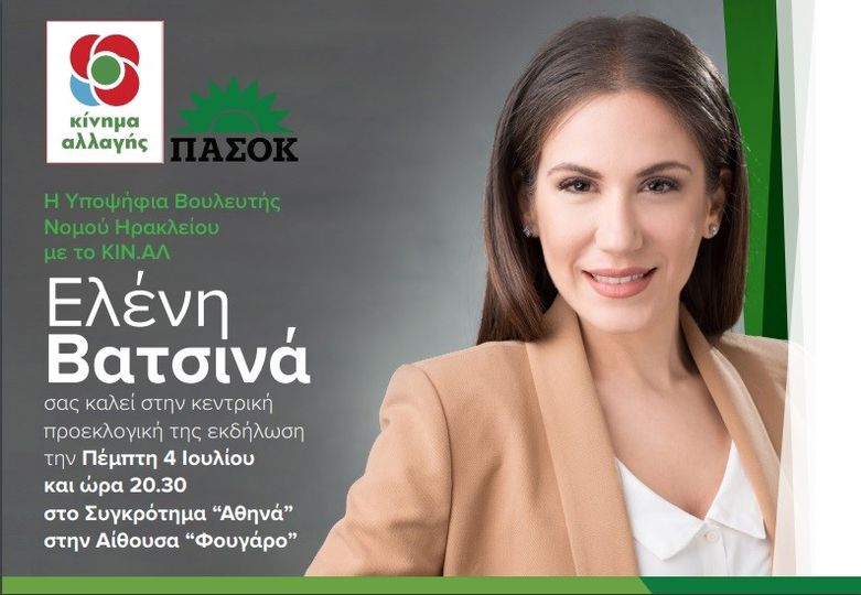 Μετρώντας αντίστροφα και λίγα 24ωρα πριν την κρίσιμη κάλπη της 7ης Ιουλίου, η υποψήφια βουλευτής με το «Κίνημα Αλλαγής» Ελένη Βατσινά προσκαλεί στην κεντρική προεκλογική της εκδήλωση, που θα πραγματοποιηθεί την ερχόμενη Πέμπτη.