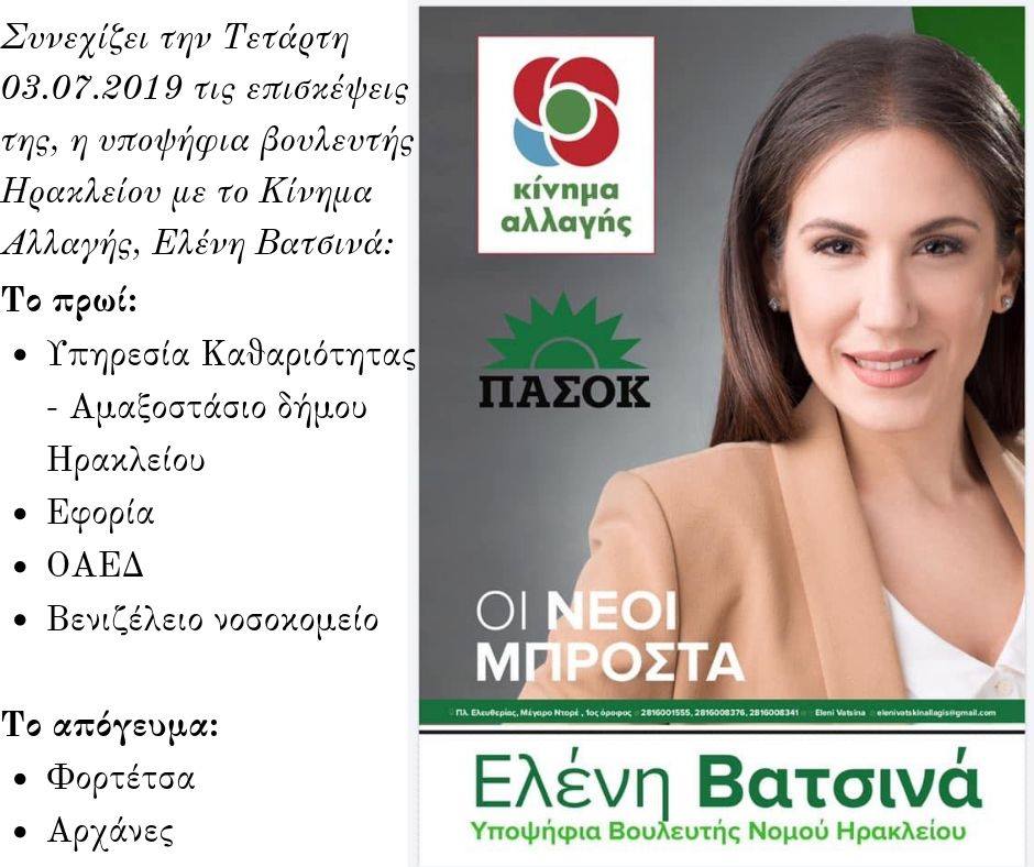 Με επισκέψεις στο Αμαξοστάσιο του δήμου Ηρακλείου, τη ΔΟΥ Ηρακλείου, τον ΟΑΕΔ και το Βενιζέλειο νοσοκομείο συνεχίζει το πρωί της Τετάρτης, η υποψήφια βουλευτής Ηρακλείου με το Κίνημα Αλλαγής, Ελένη Βατσινά.