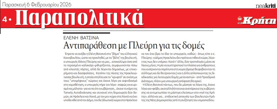 Εφημερίδα “Νέα Κρήτη” (06.02.2026) Προηγούμενο Άρθρο "Βέλη" κατά της Κυβέρνησης για το μεταναστευτικό: Πουλάτε ελπίδα στους Κρητικούς! Επόμενο Άρθρο Βουλή: Σφοδρή αντιπαράθεση για το δυστύχημα της Χίου – Ενημέρωση από Κικίλια θέλει η αντιπολίτευση για το αν επιχειρήθηκε push back