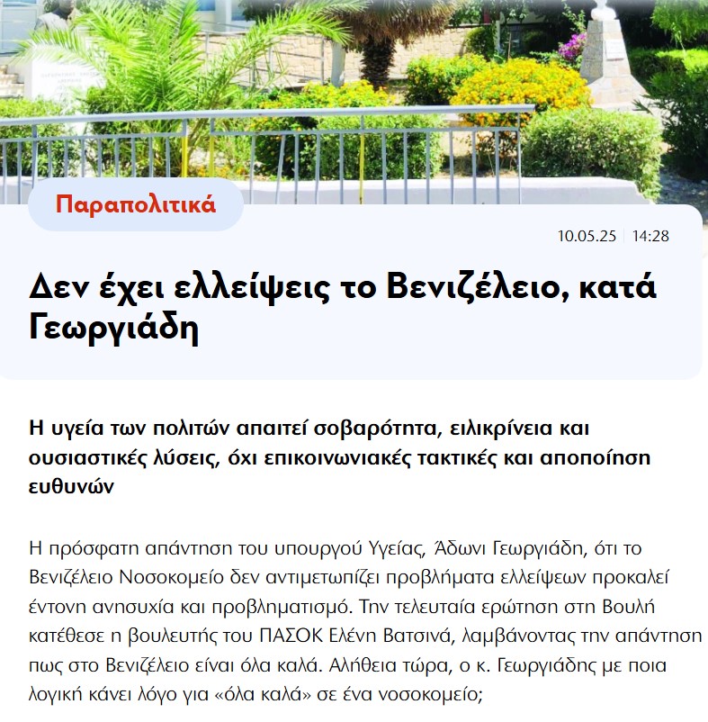 Η πρόσφατη απάντηση του υπουργού Υγείας, Άδωνι Γεωργιάδη, ότι το Βενιζέλειο Νοσοκομείο δεν αντιμετωπίζει προβλήματα ελλείψεων προκαλεί έντονη ανησυχία και προβληματισμό. Την τελευταία ερώτηση στη Βουλή κατέθεσε η βουλευτής του ΠΑΣΟΚ Ελένη Βατσινά, λαμβάνοντας την απάντηση πως στο Βενιζέλειο είναι όλα καλά. Αλήθεια τώρα, ο κ. Γεωργιάδης με ποια λογική κάνει λόγο για «όλα καλά» σε ένα νοσοκομείο;