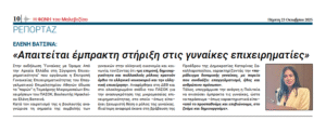 Στην εκδήλωση “Γυναίκες με Όραμα: Από την Αρχαία Ελλάδα στη Σύγχρονη Επιχειρηματικότητα” που οργάνωσε η Επιτροπή Γυναικείας Επιχειρηματικότητας του Επαγγελματικού Επιμελητηρίου Αθηνών έδωσε το “παρών” η Τομεάρχης Μικρομεσαίων Επιχειρήσεων του ΠΑΣΟΚ, Βουλευτής Ηρακλείου Ελένη Βατσινά.