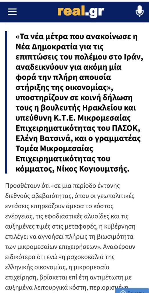 «Τα νέα μέτρα που ανακοίνωσε η Νέα Δημοκρατία για τις επιπτώσεις του πολέμου στο Ιράν, αναδεικνύουν για ακόμη μία φορά την πλήρη απουσία στήριξης της οικονομίας», υποστηρίζουν σε κοινή δήλωση τους η βουλευτής Ηρακλείου και υπεύθυνη Κ.Τ.Ε. Μικρομεσαίας Επιχειρηματικότητας του ΠΑΣΟΚ, Ελένη Βατσινά, και ο γραμματέας Τομέα Μικρομεσαίας Επιχειρηματικότητας του κόμματος, Νίκος Κογιουμτσής.