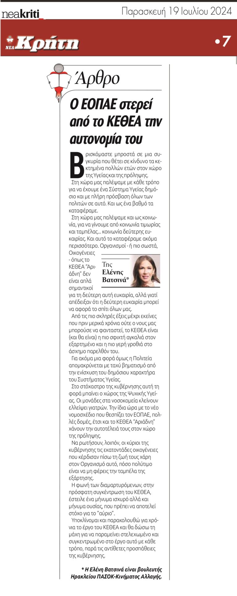 Άρθρο στην εφημερίδα “Νέα Κρήτη” (19.07.2024) Διαβάστε το άρθρο εδώ