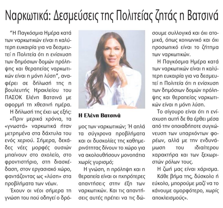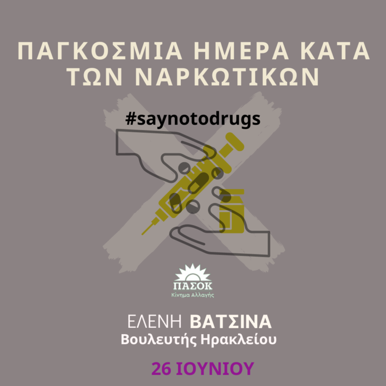 Δήλωση της βουλευτή Ηρακλείου ΠΑΣΟΚ, Ελένης Βατσινά με αφορμή την Παγκόσμια Ημέρα κατά των Ναρκωτικών Πριν μερικά χρόνια, τα «γνωστά» ναρκωτικά ήταν μετρημένα στα δάχτυλα του ενός χεριού. Σήμερα, δεκάδες νέες μορφές ουσιών μπαίνουν στο σχολείο, στο φροντιστήριο, στη διασκέδαση,…